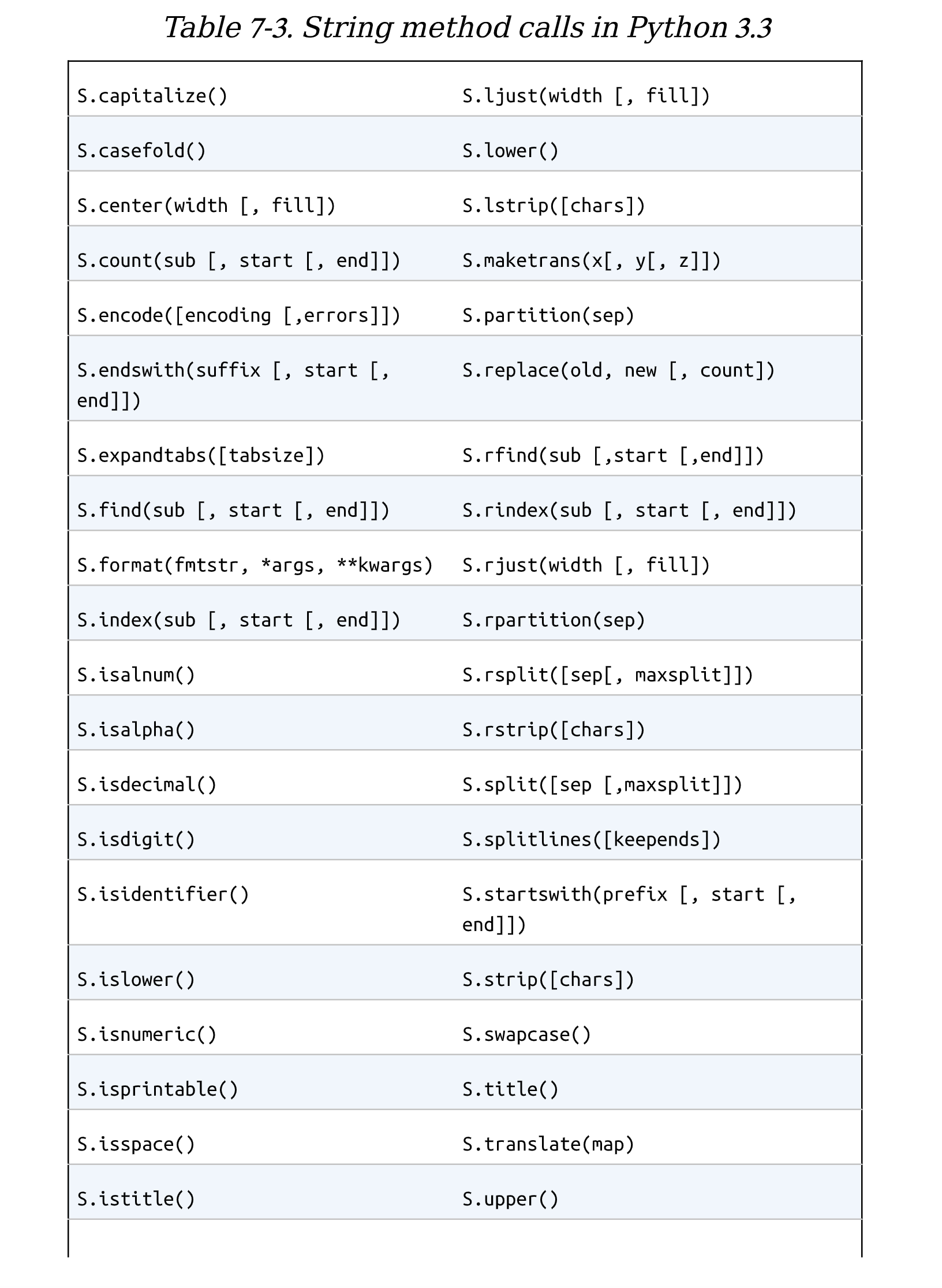 表7-3总结了python 3.3中内置字符串对象的方法和调用模式;这些方法频繁改变,所以确保检查python标准库手册来获得最新的列表,或在任何字符串(或str类型名称)上交互地运行dir或help调用。python 2系列的字符串方法稍有不同;it includes a decode, for example, because of its different handling of unicode data (something we’ll discuss in chapter 37). 在这个表中,s是字符串对象,包裹在方括号中的是可选参数。表中的字符串方法实现了高级操作如分割和连接,大小写转换,内容测试,子串搜索和替换。