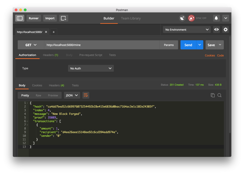 在这一点上,如果你喜欢,你可以使用一台不同的机器,并在你的网络上启动不同的节点。 或者使用同一台机器上的不同端口启动进程。 我在我的机器上,不同的端口上创建了另一个节点,并将其注册到当前节点。 因此,我有两个节点:http://localhost:5000 和 http://localhost:5001。 注册一个新节点: